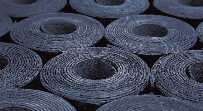 A bitumen roofing membrane usually contains limestone filler and a very high proportion of bitumen – around 65-70 percent. Low-temperature flexibility, heat resistance, the ability to withstand ageing and fire retardancy can all be affected by bitumen choice. Moreover, it represents the main mechanical characteristic of the membrane, making it a key factor in the processability of the end product.