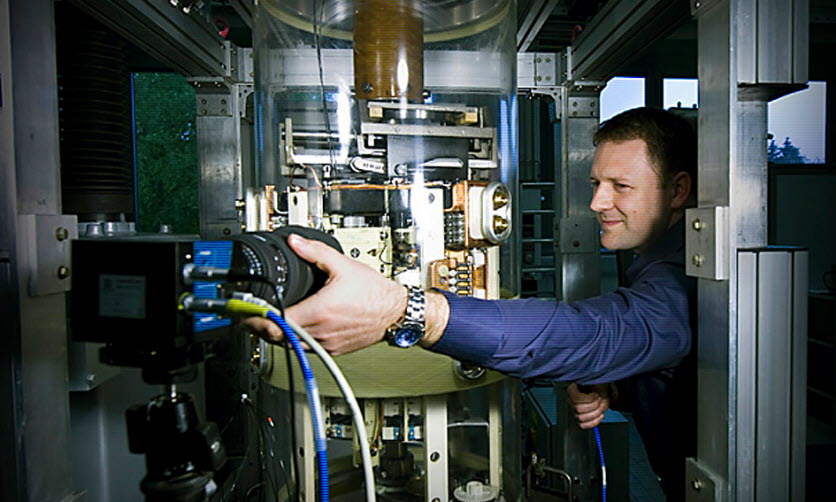 Voltage spikes of up to 1.8 million volts streak across the test room in a millionth of a second. The source is an impulse generator and the location is the Maschinenfabrik Reinhausen Research Centre in Regensburg, Germany.