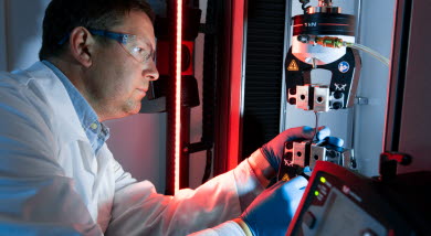 Tommie Ibert, Development Engineer, tests the new advanced video extensometer that has been installed at the Nynas Rubber Compounding Lab in Nynäshamn.