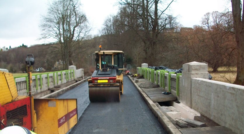 The day after the base course went in, a 60mm thick binder course of 20mm heavy duty material was laid, followed by a 40mm surfacing of hot rolled asphalt. Soon after, white lining was applied and Inchbonny bridge fully reopened to traffic much to the satisfaction of locals and other users of the A68.