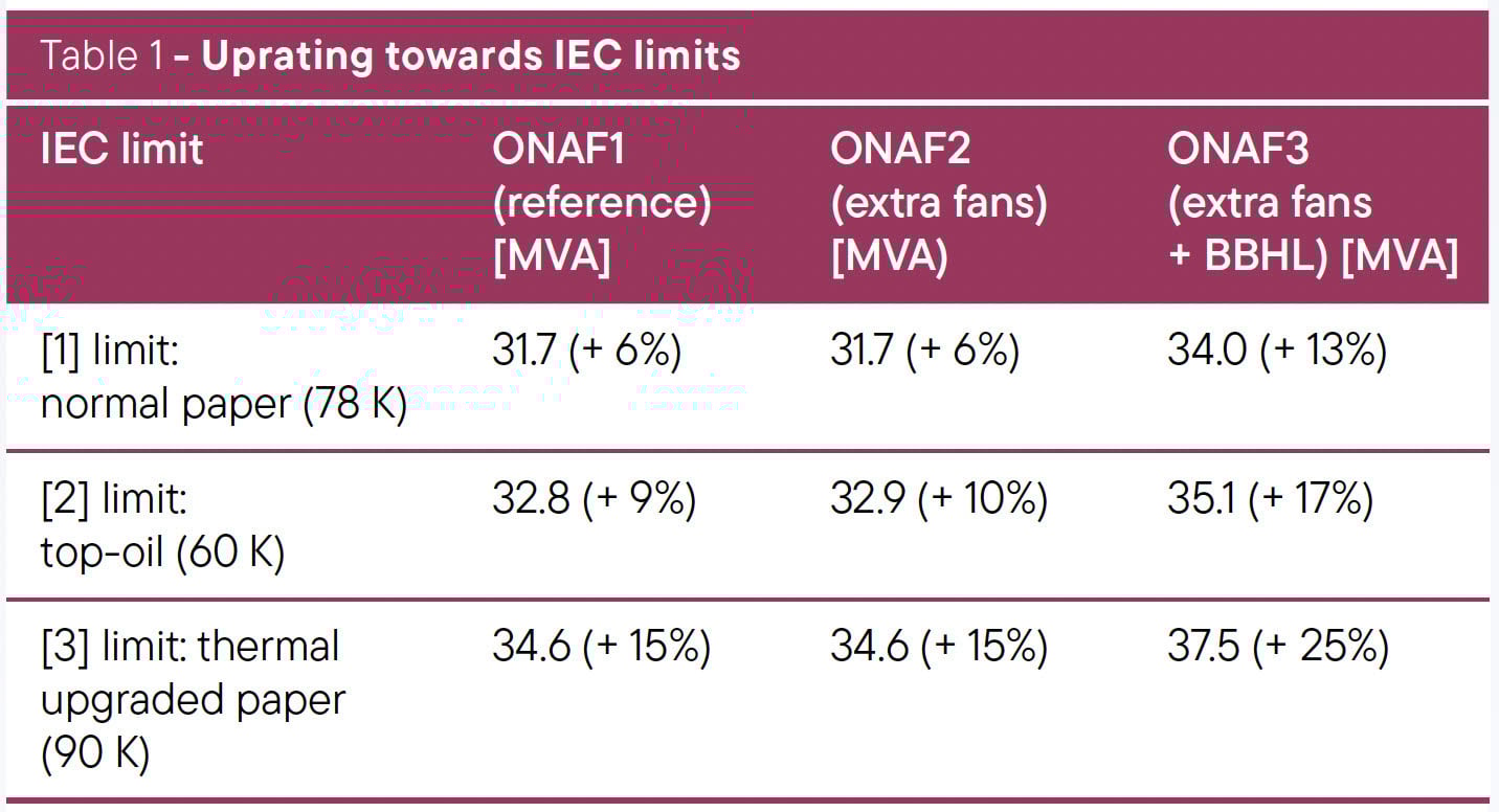 The results of this joint project show that the continuous load can be extended, and that an uprating is achievable and the expected benefits can be unlocked. Results showed a significant reduction in hot-spot temperatures up to 17 ºC. Based on those temperature reductions measured, the 100% reference tests have been extrapolated towards the IEC temperature limits for different scenarios as shown in Table 1.