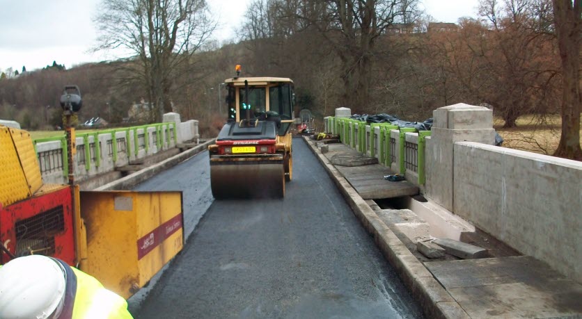 The day after the base course went in, a 60mm thick binder course of 20mm heavy duty material was laid, followed by a 40mm surfacing of hot rolled asphalt. Soon after, white lining was applied and Inchbonny bridge fully reopened to traffic much to the satisfaction of locals and other users of the A68.