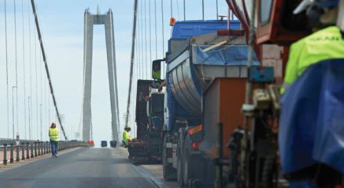 This type of polymer modified asphalt is very elastic – a crucial benefit in view of movements in the bridge. Use of a conventional asphalt can lead to cracking in the surface and aggregate can loosen. This can then abrade paint on cables and beams, resulting in expensive rust damage.