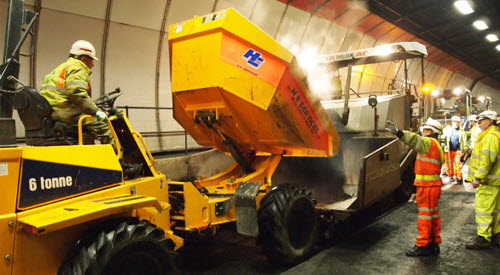 Instead the material had to be discharged at the tunnel portals, then loaded into dumpers, then delivered to the 'work face' in small quantities – at about 165°C. Two layers of asphalt were laid in the tunnel, the binder course comprising a 50/14 hot rolled asphalt, the surface course a 10mm stone mastic asphalt. Both are bound with Endura Z2.